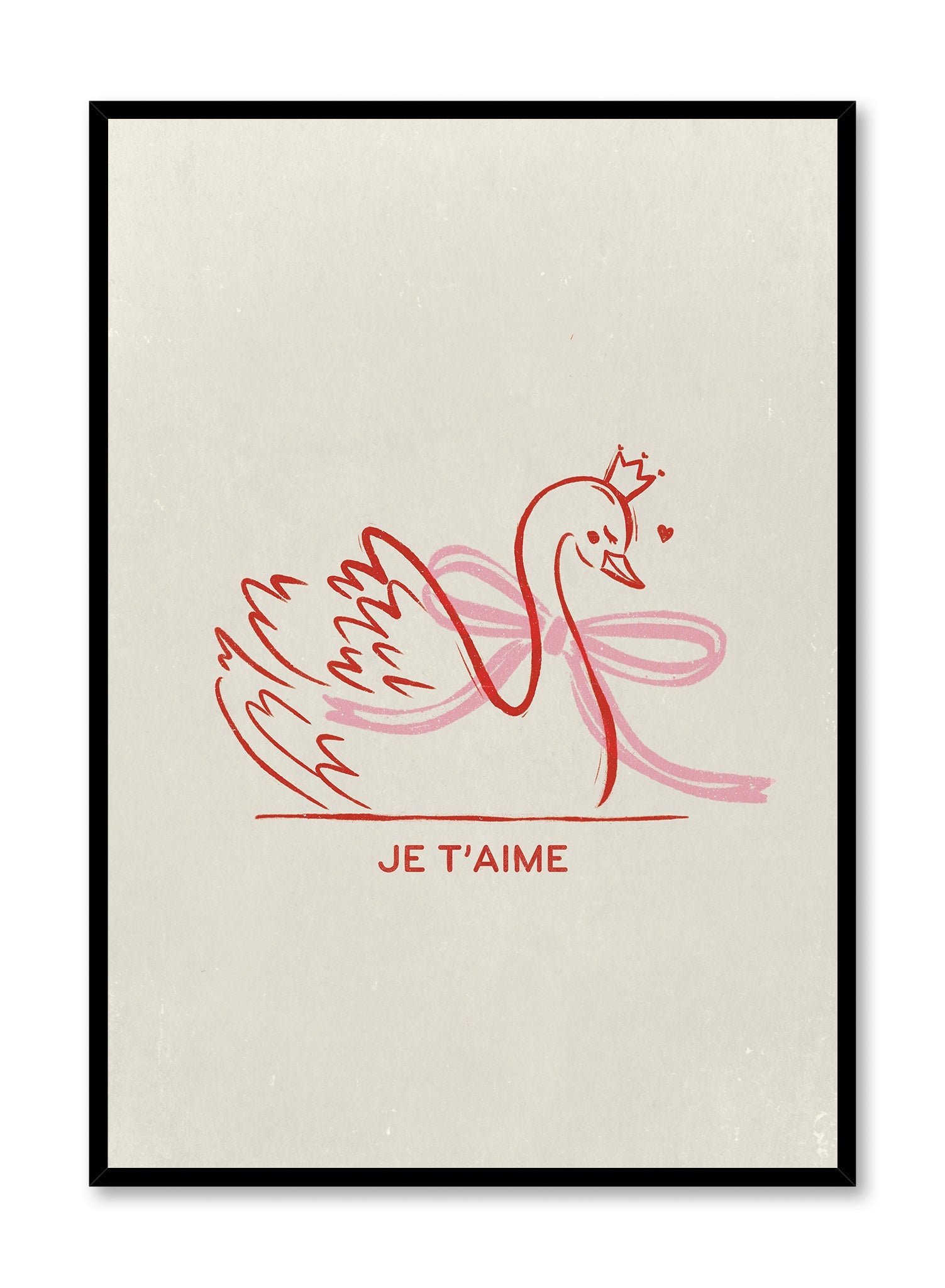 This charming print captures the essence of tender affection with a hand-drawn illustration of a swan, crowned regally and adorned with a soft pink ribbon. Beneath the graceful figure, the French phrase “Je T’aime” adds a poetic touch, evoking feelings of love and whimsy.